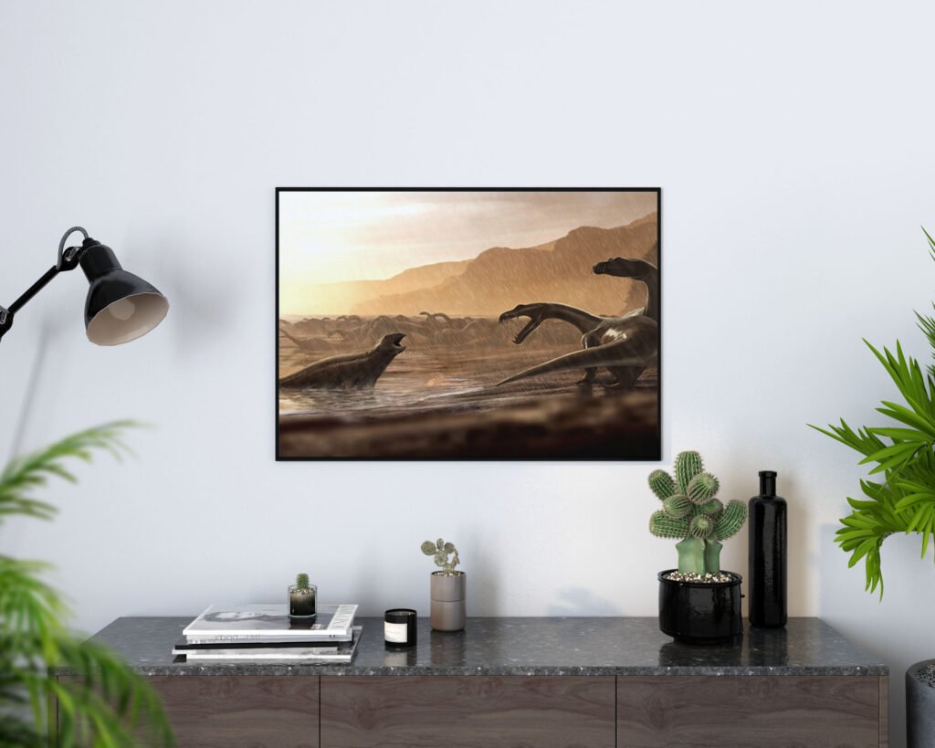 Pierwotne gady morskie, notozaury z rodzaju Nothosaurus (z prawej), gromadziły się na plaży, tworząc kolonie niczym współczesne foki. Przypadkowym przybyszem, który zakłócił ich spokój, jest plakodont Placodus (z lewej). Triasowa sprzeczka raczej nie skończy się krwawo, gdyż notozaury to rybożercy, a plakodont woli małże i jeżowce.